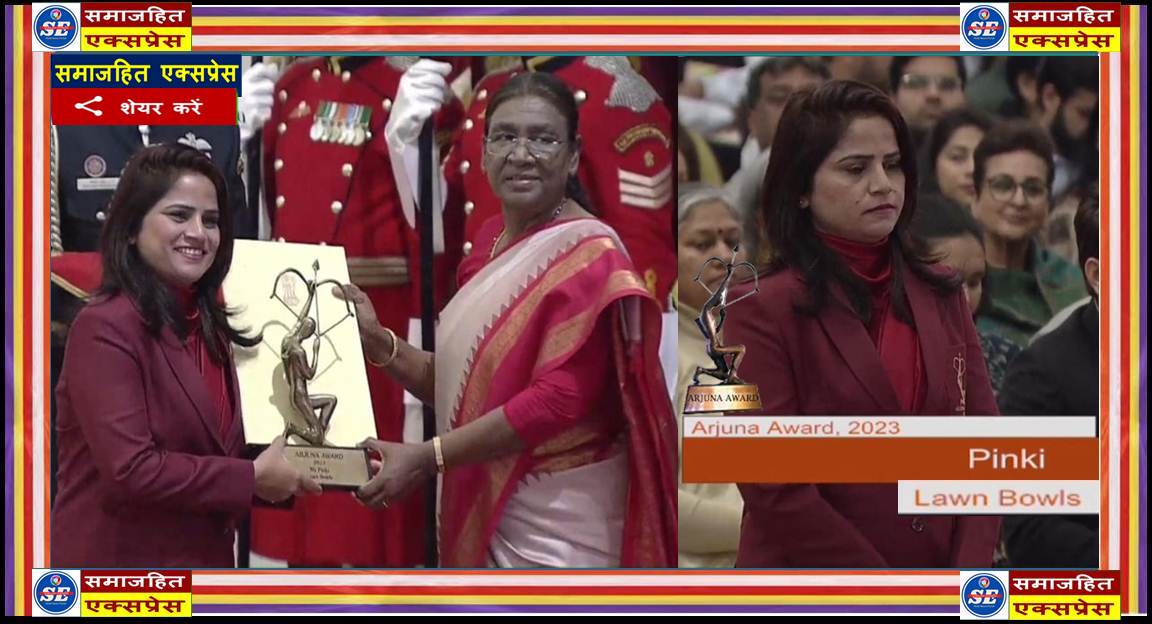 दिल्ली, समाजहित एक्सप्रेस (रघुबीर सिंह गाड़ेगांवलिया) l राष्ट्रपति भवन में राष्ट्रपति द्रौपदी मुर्मू ने राष्ट्रीय खेल पुरस्कार 2023 के तहत मंगलवार 9 जनवरी 2024 को साल 2023 में उत्कृष्ट प्रदर्शन करने वाले खिलाड़ियों को खेल रत्न और अर्जुन अवॉर्ड से सम्मानित किया गया । रैगर समाज की प्रतिभाशाली बेटी पिंकी कांसोटिया ने बर्मिघम के कॉमवेल्थ गेम्स में टीम इंडिया की ओर से खेलते हुए लॉन बॉल की बेहतरीन खिलाड़ी पिंकी कांसोटिया ने ऐतिहासिक जीत दर्ज कर स्वर्ण पदक जीतकर इतिहास रचा था । उनकी इस उपलब्धि के लिए राष्ट्रपति द्रौपदी मुर्मू द्वारा तालियों की गड़गड़ाहट के बीच उन्हें अर्जुन अवॉर्ड से सम्मानित किया गया l यह भारत का दूसरा सबसे बड़ा ऐथलेटिक सम्मान है ।