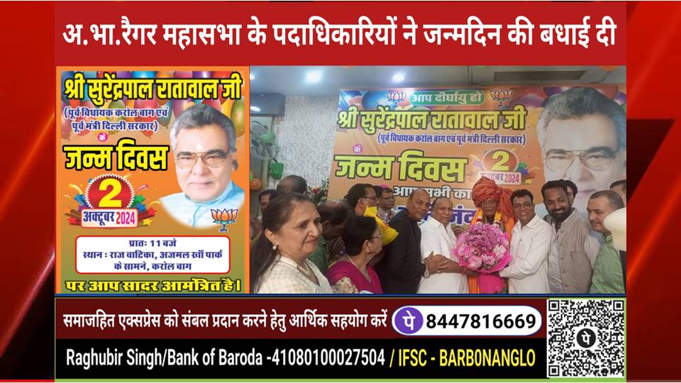 दिल्ली, समाजहित एक्सप्रेस (रघुबीर सिंह गाड़ेगांवलिया) l दिल्ली के पूर्व मंत्री माननीय सुरेंद्रपाल रातावाल जी के 02 अक्टूबर 2024 को 76वें जन्मदिन के अवसर पर रातावाल परिवार की ओर से दिल्ली के करोलबाग स्थित राज वाटिका में जन्मदिन समारोह आयोजित कर मनाया गया । जन्मदिन समारोह मे रैगर समाज और भाजपा के गणमान्य लोग शामिल होकर श्री सुरेंद्रपाल रातावाल जी (पूर्व मंत्री दिल्ली सरकार) को जन्मदिन की हार्दिक शुभकामनायें एवं बधाई दी।