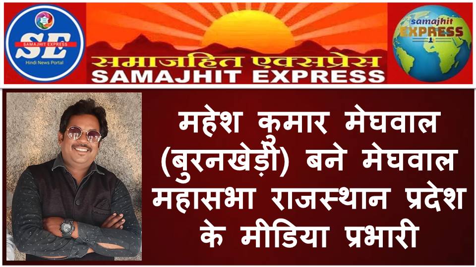 दिल्ली, समाजहित एक्सप्रेस (पत्रकार रामलाल रैगर) l मेघवाल महासभा राजस्थान की प्रदेश स्तरीय कार्यकारिणी के प्रस्ताव संख्या 92 के अनुसार राजस्थान राज्य के मेघवाल महासभा कि प्रदेश स्तरीय कार्यकारिणी में महेश कुमार मेघवाल (बुरनखेड़ी) पिता लालचंद मेघवाल (बुरनखेड़ी) को प्रदेश मीडिया प्रभारी के पद पर नियुक्त किया गया ।