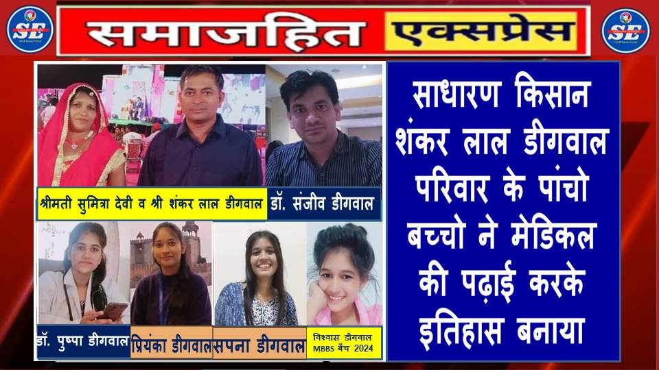 दिल्ली, समाजहित एक्सप्रेस (रघुबीर सिंह गाड़ेगांवलिया) l ग्राम जाहोता, तहसील आमेर, जिला जयपुर के एक साधारण किसान शंकर लाल डीगवाल परिवार में एक पुत्र एवं चार पुत्रियां हैं। रैगर समाज के इस परिवार के पांचो बच्चो ने मेडिकल की पढ़ाई की, जिनमे से वर्तमान एक पुत्र और एक पुत्री दोनो चिकित्सा अधिकारी है और दो पुत्रियां इसी वर्ष एमबीबीएस का कोर्स पूरा करने जा रही हैं। सबसे छोटी बेटी वर्ष 2024 में तेलंगाना राज्य में एमबीबीएस में पढ़ाई हेतु गई है। इस तरह पांचो बच्चो ने मेडिकल की पढाई कर सभी के लिए एक प्रेरणादाई उदाहरण पेश किया है। इन बच्चो ने उच्च शिक्षा प्राप्त करने में डीगवाल परिवार व रैगर समाज का नाम रोशन किया है।