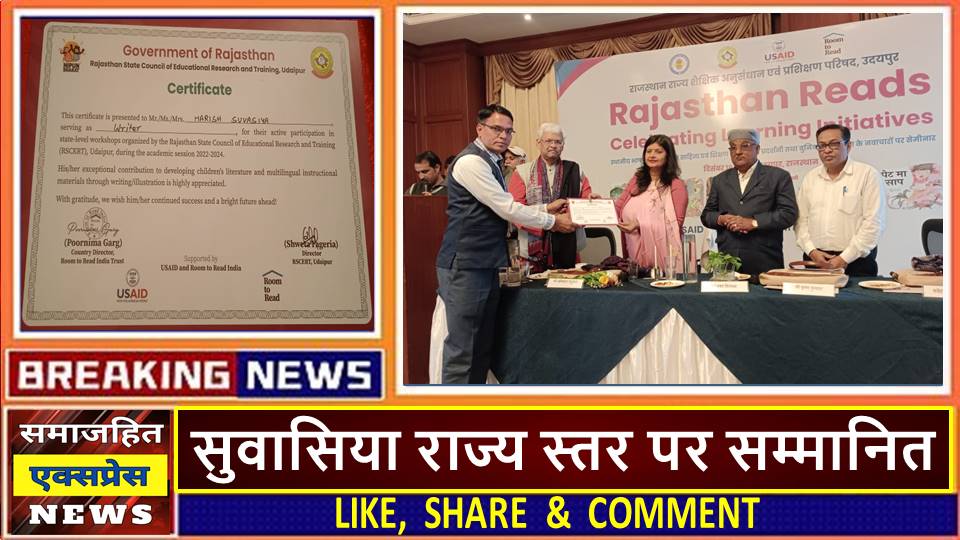 दिल्ली, समाजहित एक्सप्रेस (रघुबीर सिंह गाड़ेगांवलिया) l शिक्षा विभाग राजस्थान सरकार द्धारा जयपुर मे मनाये”राजस्थान रीड सेलीब्रिटिंग लर्निंग इनीशिएटिव” कार्यक्रम मे व्याख्याता एवं साहित्यकार हरीश सुवासिया को सम्मानित किया गया।