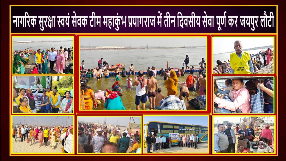 प्रयागराज में आयोजित महाकुम्भ में अपार श्रद्धालुओं की भीड़ को देखते हुए जयपुर से नागरिक सुरक्षा वार्डनों ने स्थानीय प्रशासन के सहयोग के लिए अनुशासित व अनुभवी वार्डनों की टीम जिसको गत 18 फ़रवरी 2025 को विधायक कालीचरण सरॉफ ने बस को हरी झंडी दिखाकर महाकुम्भ के लिए रवाना किया था।