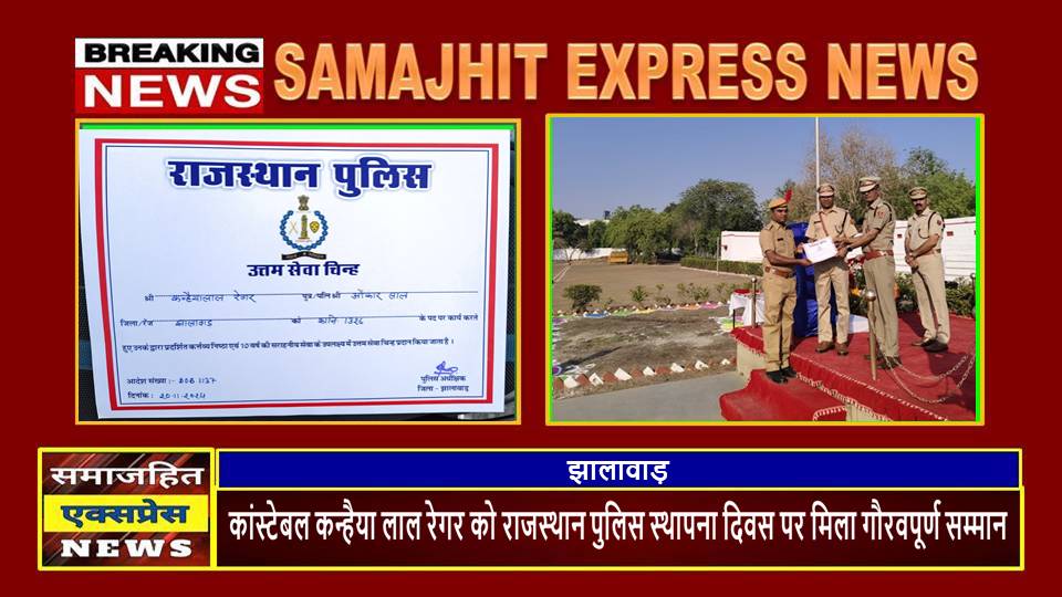 राजस्थान पुलिस स्थापना दिवस के अवसर पर चिरंजीलाल मीणा अतिरिक्त पुलिस अधीक्षक झालावाड़ के कर-कमलो द्वारा कांस्टेबल के पद पर कार्यरत कन्हैया लाल रेगर को पुलिस सेवा में कर्तव्य, निष्ठा एवं सराहनीय सेवा के लिए उत्तम सेवा चिन्ह एवं प्रशंसा पत्र प्रदान कर सम्मानित किया गया। सम्मानित होने के उपरांत कन्हैया लाल रेगर को स्टाप एवं परिचितों ने सोशल मीडिया के माध्यम से हार्दिक शुभकामनाएं दी l इस अवसर पर कन्हैया लाल रेगर ने पुलिस के आलाधिकारीयो,पुलिस स्टाप एवं परिचितों का दिल की गहराइयों से धन्यवाद प्रकट किया l