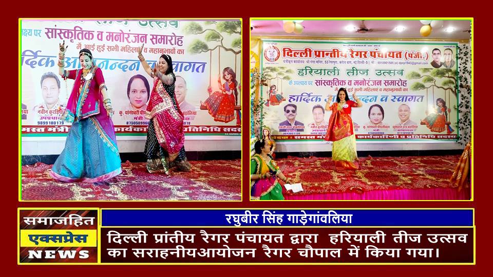 दिल्ली , समाजहित एक्सप्रेस (रघुबीर सिंह गाड़ेगांवलिया) l दिल्ली प्रांतीय रैगर पंचायत (पंजीकृत) के तत्वाधान में सताईस जुलाई दो हजार पच्चीस रविवार को रैगर समाज का बाहुल्य क्षेत्र करोल बाग मे राजस्थानी संस्कृति के प्रतीक तीज के त्योहार को जीवन्त रखने के उद्देश्य से बड़े ही उत्साह और उमंग के साथ हरियाली तीज उत्सव का सराहनीयआयोजन रैगर चौपाल में किया गया। आस्था, उमंग, सौंदर्य और प्रेम का यह हरियाली तीज उत्सव शिव-पार्वती के पुनर्मिलन के उपलक्ष्य में मनाया जाता है। हरियाली तीज मुख्य रूप से उत्तर भारत में, विशेषकर राजस्थान, उत्तर प्रदेश, बिहार और हरियाणा में मनाई जाती है ।