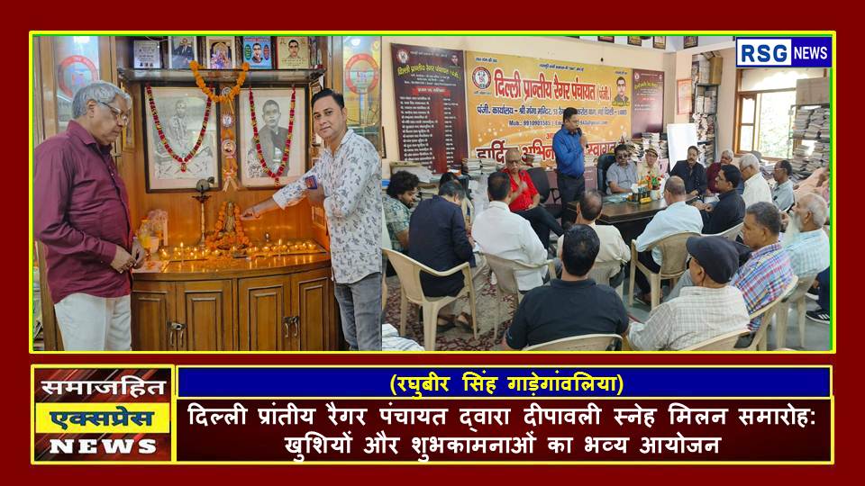 दिल्ली, समाजहित एक्सप्रेस (रघुबीर सिंह गाड़ेगांवलिया) l दिल्ली में रैगर समाज की सर्वोच्च संस्था दिल्ली प्रांतीय रैगर पंचायत (पंजी०) के तत्वाधान में दिवाली के उपलक्ष्य में शनिवार 18 अक्टूबर 2025 को श्री गंगा मंदिर स्थित कार्यालय में दिवाली मंगल मिलन समारोह का आयोजन किया गया। इस कार्यक्रम में पंचायत मंत्रिमंडल, युवा प्रकोष्ठ, कार्यकारिणी सदस्यों और क्षेत्रीय पंचायत के पदाधिकारीगण ने उत्साह पूर्वक भाग लिया। दिवाली से पहले ही धन तेरस को समाज में आपसी भाईचारे और खुशियों की रोशनी से दिल्ली प्रांतीय रैगर पंचायत का कार्यालय आलोकित किया गया । समारोह का वातावरण बेहद उत्साहपूर्ण और आनंदमय रहा जिसमें दीपावली की खुशी हर चेहरे पर झलक रही थी ।
