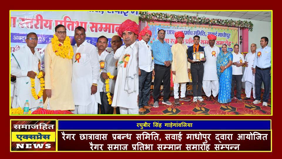 दिल्ली, समाजहित एक्सप्रेस (रघुबीर सिंह गाड़ेगांवलिया) । रैगर छात्रावास प्रबंधन समिति सवाई माधोपुर के तत्वाधान में आज उत्सव मैरिज गार्डन सवाई माधोपुर में रैगर समाज प्रतिभा सम्मान समारोह आयोजित किया गया । जिसमें कार्यक्रम के मुख्य अतिथि माननीय टी आर वर्मा सेवानिवृत्त आईएएस एवं विशिष्ट अतिथि डॉ गजेंद्र वर्मा, श्री सन्तोष कुमार मीणा अतिरिक्त जिला शिक्षा अधिकारी, चंद्र कला वर्मा राजस्व अधिकारी, हरिशंकर फुलवारिया प्राचार्य नवोदय विधालय मंदसौर, संरक्षक रामदयाल गुसाईवाल, नेमराज बाकोलिया प्राचार्य, दीनदयाल तसीवाल एवं अध्यक्षता केदारलाल ढिंढोरिया ने की, कार्यक्रम का शुभारंभ भारत रत्न बाबा साहेब भीमराव अम्बेडकर की तस्वीर को माल्यार्पण कर एवं दीप प्रज्वलित कर किया गया ।