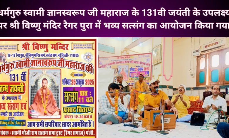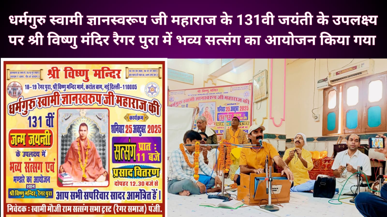 दिल्ली, समाजहित एक्सप्रेस (रघुबीर सिंह गाड़ेगांवलिया) । धर्म गुरु स्वामी ज्ञानस्वरूप जी महाराज की 131वीं जन्म जयंती के उपलक्ष्य पर ऐतिहासिक गुरुद्वार श्री विष्णु मंदिर में स्वामी ज्ञानस्वरूपजी महाराज सत्संग सभागार,19 रैगर पुरा के प्रांगण में स्वामी मौजीराम सत्संग सभा ट्रस्ट (रैगर समाज) पंजीकृत के प्रधान यतींद्र कुमार मोहनपुरिया, महामंत्री डॉ सुभाष चंद्र कानखेडिया, कोषाध्यक्ष पृथ्वी राज डीगवाल, मंत्री दिनेश कुमार कानखेडिया, कार्यालय मंत्री ज्ञानेश्वर तोणगरिया ट्रस्टी, माम चंद तोणगरिया, हेमराज खजोतिया, मदन लाल सबलानिया, पंकज कानखेडिया, विशेष सहयोगी गिरधारी लाल डीग वाल व समस्त ट्रस्टी स्वयं सेवक मंडल के तत्वावधान में आज दिनांक 25 अक्टूबर 2025 को भव्य सत्संग आयोजित किया गया ।