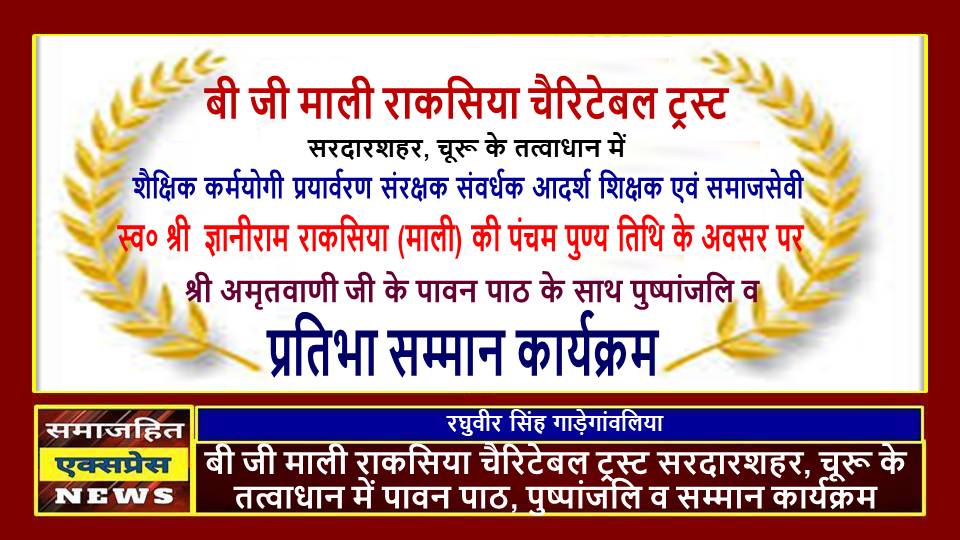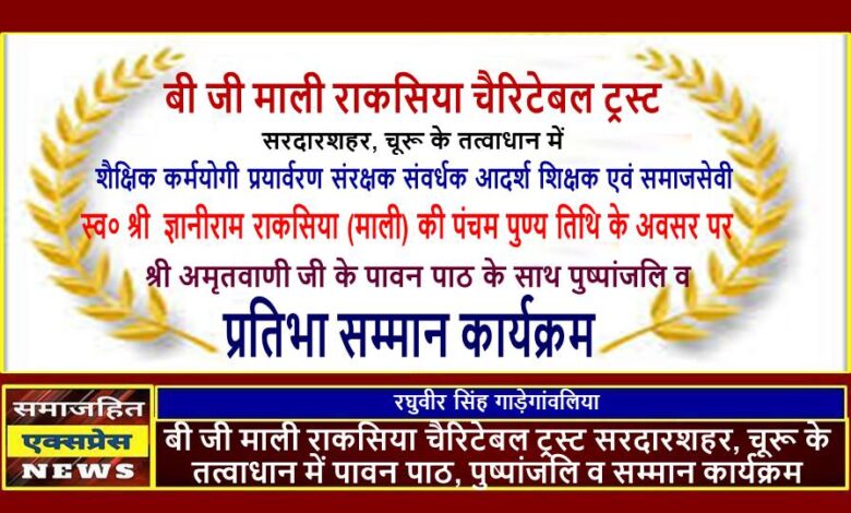 दिल्ली, समाजहित एक्सप्रेस (रघुवीर सिंह गाड़ेगांवलिया) । बुधाराम ज्ञानी राम माली राकसिया चैरिटेबल ट्रस्ट सरदारशहर, चूरू के तत्वाधान में शैक्षिक कर्मयोगी प्रयार्वरण संरक्षक संवर्धक आदर्श शिक्षक एवं समाजसेवी स्व० श्री ज्ञानीराम राकसिया (माली) की पंचम पुण्य तिथि के अवसर पर शनिवार 13 दिसंबर 2025 को ज्ञान वाटिका, सरस्वती शिक्षक प्रशिक्षण महाविद्यालय, काका कॉलोनी सरदारशहर में प्रात: 10 बजे से श्री अमृतवाणी जी के पावन पाठ के साथ पुष्पांजलि कार्यक्रम होने जा रहा है।