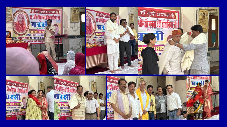 माता स्व. श्रीमति मनवा देवी दोतानिया जी की प्रथम पुण्यतिथि के अवसर पर दोतानिया परिवार की ओर से श्री विष्णु मंदिर रैगर पुरा में सत्संग का आयोजन किया गया l जिसमे सैकडो महिला-पुरूष सत्संग प्रेमियो ने अपनी उपस्थिति दर्ज की l समाजसेवी हरीश दोतानिया ने सभी का स्वागत सम्मान किया l सत्संग में ललित राजस्थानी मण्डली व राजस्थान से विशेष आमन्त्रित डा.राजपाल सबलाणिया जी ने अपनी मधुर वाणी व मधुर भजनों से सत्संग में उपस्थित सभी सत्संग प्रेमियो को सराबोर किया l दोपहर 2 बजे आरती की गई l आरती के पश्चात प्रति भोज करवाया गया l