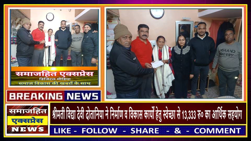 दिल्ली, समाजहित एक्सप्रेस (रघुबीर सिंह गाड़ेगांवलिया) l मादीपुर स्थित श्री विष्णु मंदिर में जन सहयोग से निर्माण व विकास कार्यों को गति प्रदान करने के लिए रैगर समाज पंचायत मादीपुर द्वारा धन संग्रह अभियान चलाया जा रहा है, जिसके तहत जो व्यक्ति अपनी इच्छा से दान देना चाहे, वह दे सकता है l नववर्ष के उपलक्ष्य पर 01 जनवरी 2025 को श्रीमती विद्या देवी दोतानिया ने स्वेच्छा से 13,333 रूपये का आर्थिक सहयोग प्रदान किया । समाज के लोग अपनी आस्था और आर्थिक स्थिति के अनुसार आर्थिक सहयोग प्रदान कर रहे हैं। जो समाज के अन्य लोगो के लिए अनुकरणीय है l