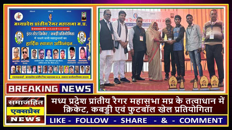 दिल्ली, समाजहित एक्सप्रेस (रघुबीर सिंह गाड़ेगांवलिया) l मध्य प्रदेश प्रांतीय रैगर महासभा मप्र के तत्वाधान में रैगर समाज के प्रतिभावान खिलाडियों को खेलो के लिए प्रोत्साहित करने के उद्देश्य से 29 जनवरी से 0 2 फरवरी तक हायर सेकेंडरी स्कूल खेल मैदान धनेरिया कलां बघाना नीमच पर पांच दिवसीय क्रिकेट/कबड्डी/फूटबाल प्रतियोगिता का आयोजन किया जा रहा है। 0 2 फरवरी को युवक-युवतियों का परिचय सम्मलेन भी किया जायेगा l