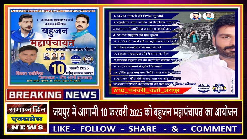 दिल्ली, समाजहित एक्सप्रेस (पत्रकार रामलाल रैगर) l राजस्थान में अनुसूचित जाति/अनुसूचित जनजाति पर हो रहे अत्याचारों के खिलाफ जयपुर में शहीद स्मारक पर आगामी 10 फरवरी 2025 को होने वाली बहुजन महापंचायत में निम्न मांगो को लेकर बहुजन महापंचायत l