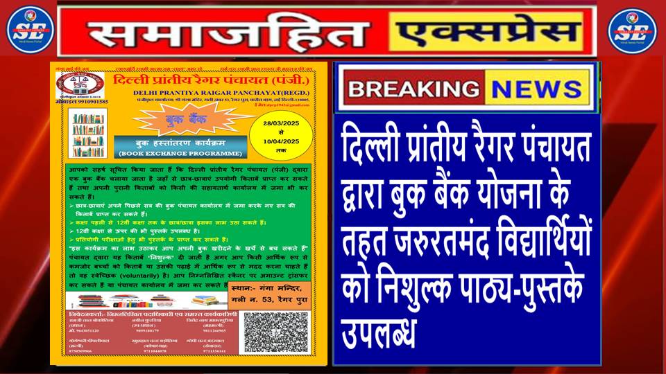 दिल्ली, समाजहित एक्सप्रेस (रघुबीर सिंह गाड़ेगांवलिया) l दिल्ली प्रांतीय रैगर पंचायत द्वारा बुक बैंक योजना के तहत जरुरतमंद विद्यार्थियों को किताबें उपलब्ध कराई जाती है। बुक बैंक में नई व पुरानी पुस्तकों को संजोकर रखा जाता है। पंचायत से विद्यार्थी अपनी कक्षा अनुसार पाठ्य-पुस्तके पढ़ने के लिए प्राप्त कर सकते है। यहीं नहीं पूर्व विद्यार्थी भी संबंधित पुस्तकों को बुक बैंक में किसी अन्य विद्यार्थी की सहायतार्थ जमा करा सकते हैं।
