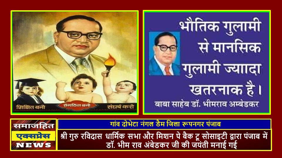 दिल्ली, समाजहित एक्सप्रेस (रघुबीर सिंह गाड़ेगांवलिया) l श्री गुरु रविदास धार्मिक सभा और मिशन पे बैक टू सोसाइटी की ओर से गांव दोभेटा नंगल डैम जिला रूपनगर पंजाब में भारत रत्न डॉ. भीम राव अंबेडकर की जयंती मनाई गई। अंबेडकर जयंती के कार्यक्रम में स्थानीय लोगों ने भारत रत्न बाबा साहब डॉ. भीम राव अंबेडकर जी के चित्र पर फूलमाला अर्पित कर उन्हें याद किया।