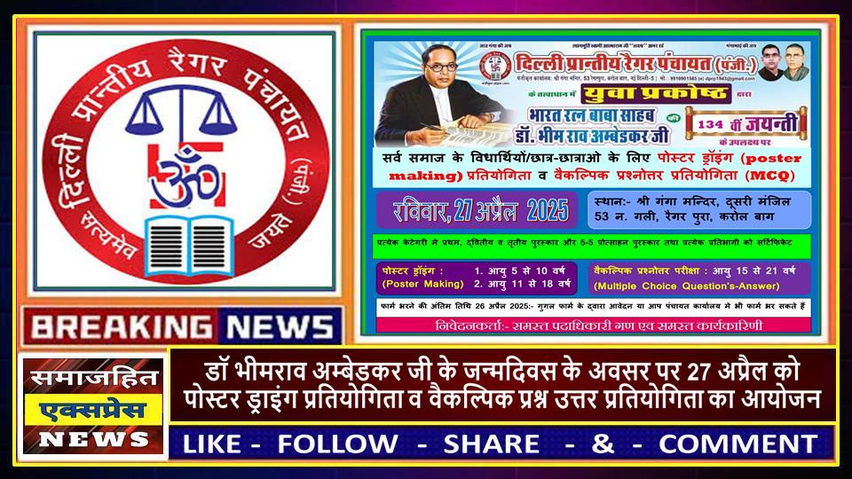 दिल्ली, समाजहित एक्सप्रेस (रघुबीर सिंह गाड़ेगांवलिया) l दिल्ली प्रान्तीय रैगर पंचायत (पंजी.) के तत्वधान में युवा प्रकोष्ठ द्वारा डॉ भीमराव अम्बेडकर जी के जन्मदिवस के अवसर पर दिनांक 27 अप्रैल 2025 को पोस्टर ड्राइंग प्रतियोगिता व वैकल्पिक प्रश्न उत्तर प्रतियोगिता का आयोजन किया जायेगा। जिसके लिए इच्छुक प्रतिभागी ऑनलाइन https://forms.gle/7DtymsTqHKEqnC8D6 या 26 अप्रैल 2025 तक व्यक्तिगत रूप से पंचायत कार्यालय में आवेदन फॉर्म जमा कर सकते हैं।